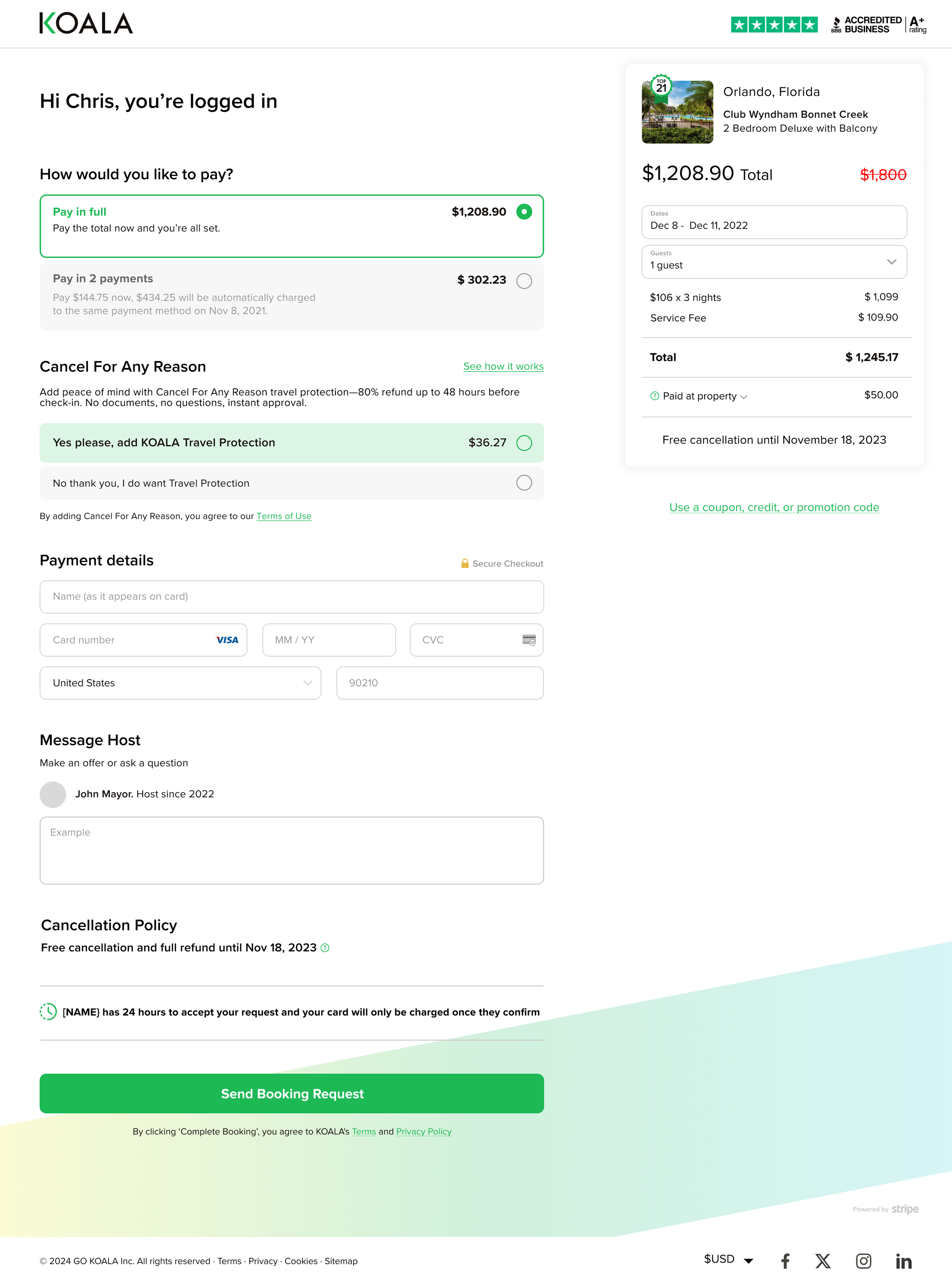 To remedy these, we consolidated the checkout flow, allowed users to split their payments, and introduced trust components (such as the ability to add trip insurance), increasing checkout completion by ~30%.